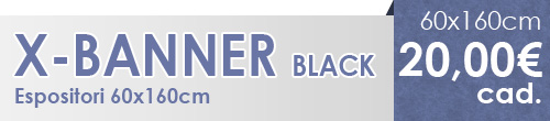 Il prodotto è indicato per esigenze promozionali di breve durata, pur presentando una struttura estremamente stabile. X Banner Black è dotato di 4 braccetti anteriori fissi, ciascuno munito di aggancio uncinato scorrevole per personalizzare a piacere la posizione delle grafiche. Per contenere al massimo i costi, la struttura è realizzata in fibra di vetro e plastica e, per tutelare la sua qualità, viene consegnata insieme a una custodia morbida di nylon.